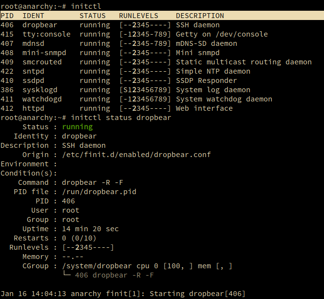 If you’re interesting in trying Finit out yourself, but haven’t got the time or patience to set it up. Here is a x86_64 VM image for QEMU on, based on myLinux.